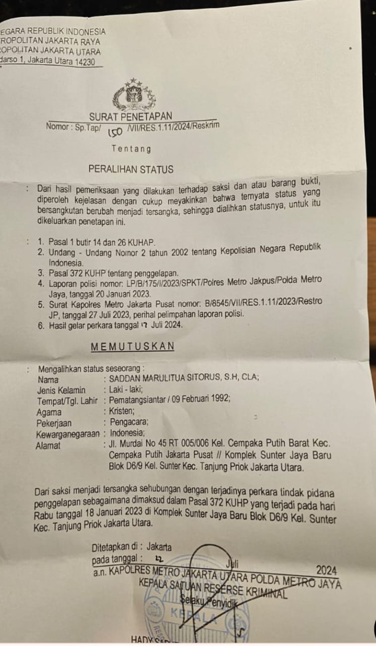 Setelah melalui proses gelar perkara, akhirnya Polres Jakarta Utara menetapkan Saddan Sitorus sebagai Tersangka penggelap mobil operasional LQ Indonesia Lawfirm.