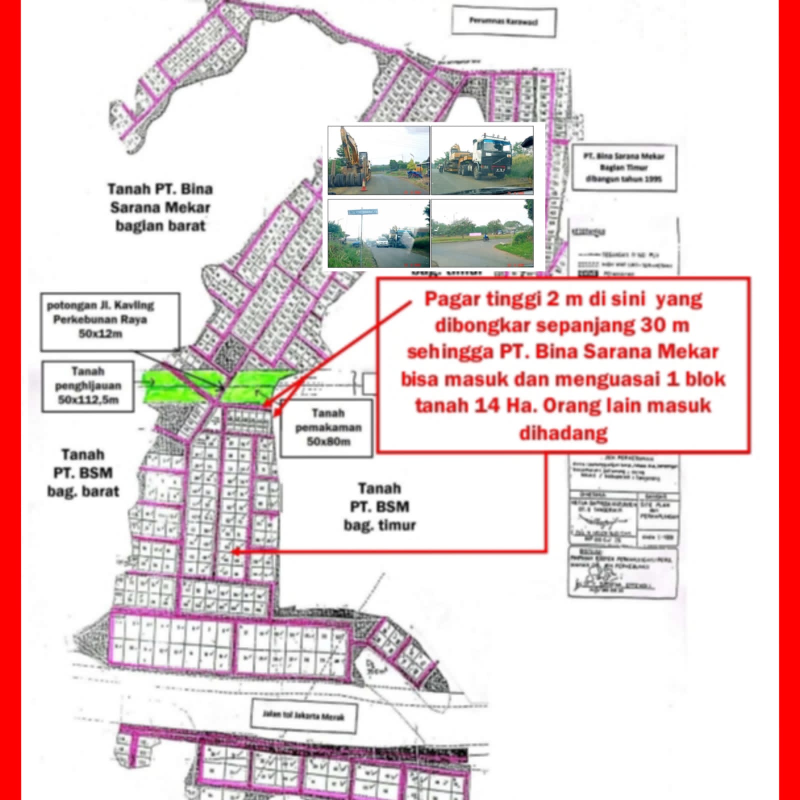 Namun, upaya tersebut terhambat ketika PT Bina Sarana Mekar melarang masuknya alat berat ke lokasi pembangunan.